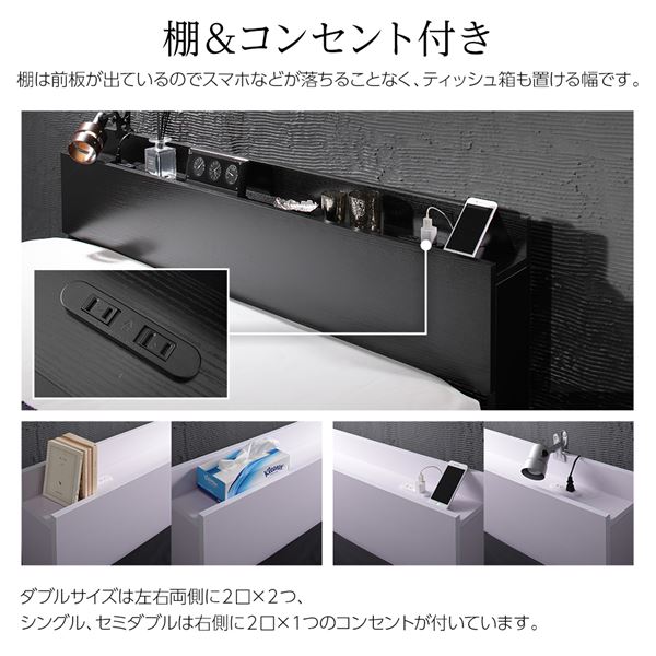 ■商品スペック【ベッドフレーム本体】 ■サイズ  シングル:(約)幅97x長さ210x高さ69cm  セミダブル:(約)幅120x長さ210x高さ69cm  ダブル:(約)幅140x長さ210x高さ69cm  床板までの高さ:(約)24cm  引き出し有効内寸:(約)横92x奥行37x高さ8cm ■材質 合成樹脂化粧パーティクルボード ■カラー ブラック、ホワイト ■機能 シングル、セミダブル:2口コンセント(1500W)     ダブル:2口コンセント(1500W)×2 ■品質保証 1年間 ■生産国 中国 ■梱包サイズ・重量 梱包数:3  シングル:(約)101x27x14cm・10kg、100x43x12cm・7kg、97x49x12cm・10kg  セミダブル:(約)122x27x14cm・15kg、100x43x12cm・7kg、61x49x21cm・12kg  ダブル:(約)144x27x14cm・20kg、100x43x12cm・7kg、74x49x21cm・14kg  ※各サイズ・重量は概算です。