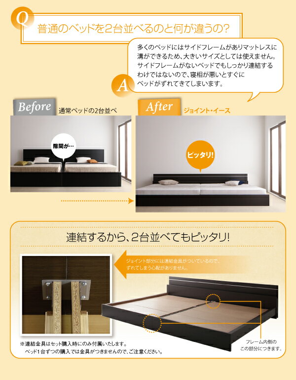 しっかり連結でベッドがずれないから、寝ている間に動いても安心!Q.普通のベッドを2台並べるのと何が違うの?A.多くのベッドにはサイドフレームがありマットレスに溝ができるため、大きいサイズとしては使えません。